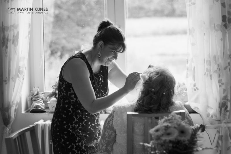 Tenhle odstavec bude vážně krátký a stručný. Vzhledem k tomu, že byl obřad naplánovaný na sobotu, domluvili jsme se s budoucí nevěstou a na místo jsme dorazili už v pátek večer. Jednak proto, aby si mohly s přítelkyní (také Lucka a na této svatbě zároveň svědkyně) užít trochu času „na pokec“ a také proto, abych se mohl focení věnovat v klidu, po celý den, včetně příprav a všeho okolo. V sobotu ráno dorazily květiny, dámy se pustily do česání, líčení a potřebných příprav, já mezitím fotil a pomáhal s tím, co zrovna bylo potřeba.