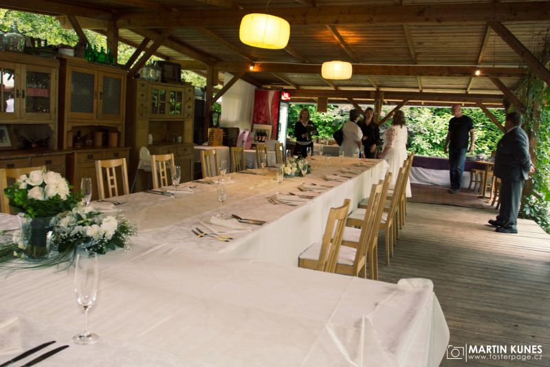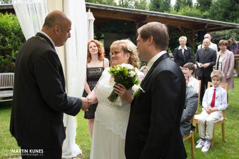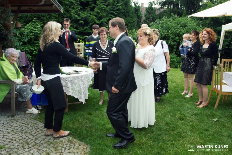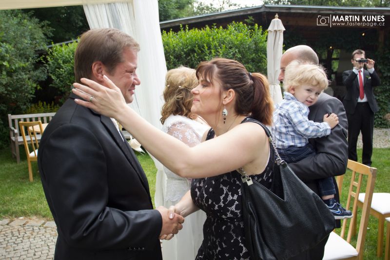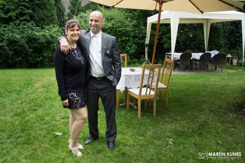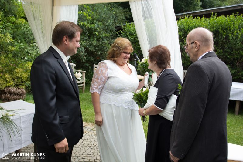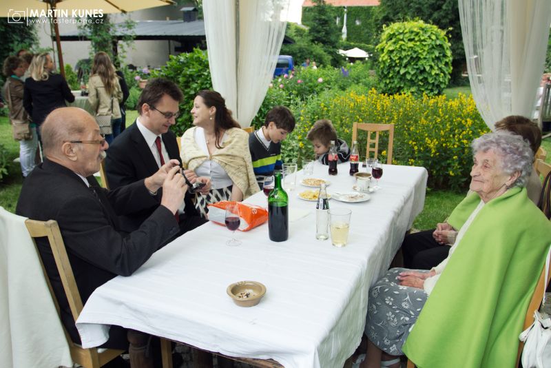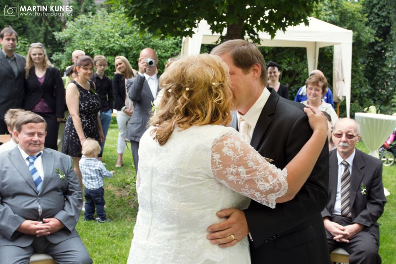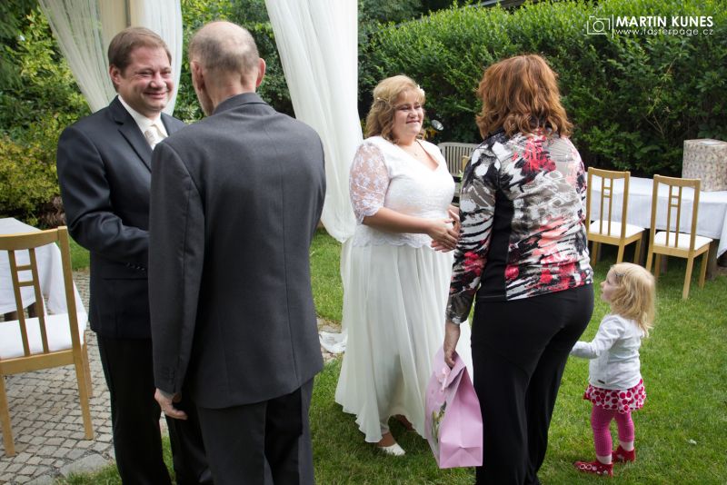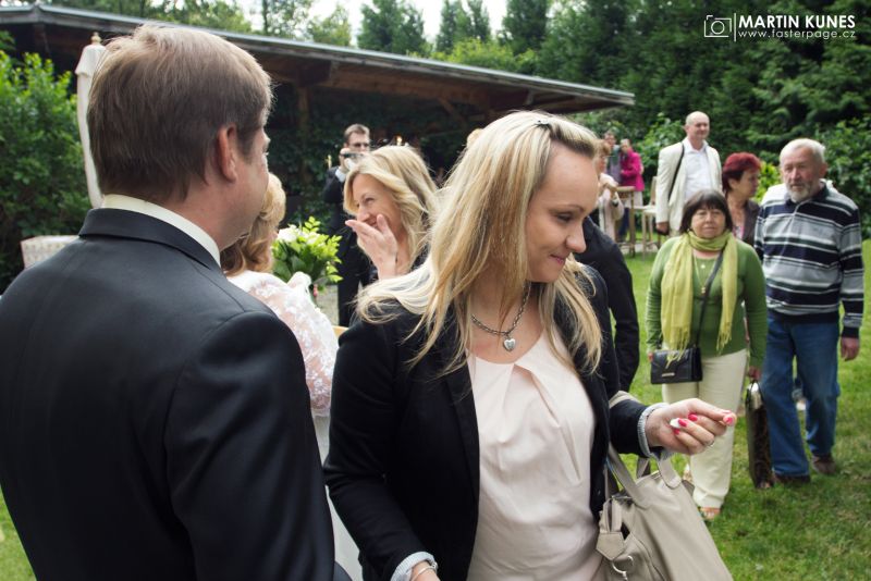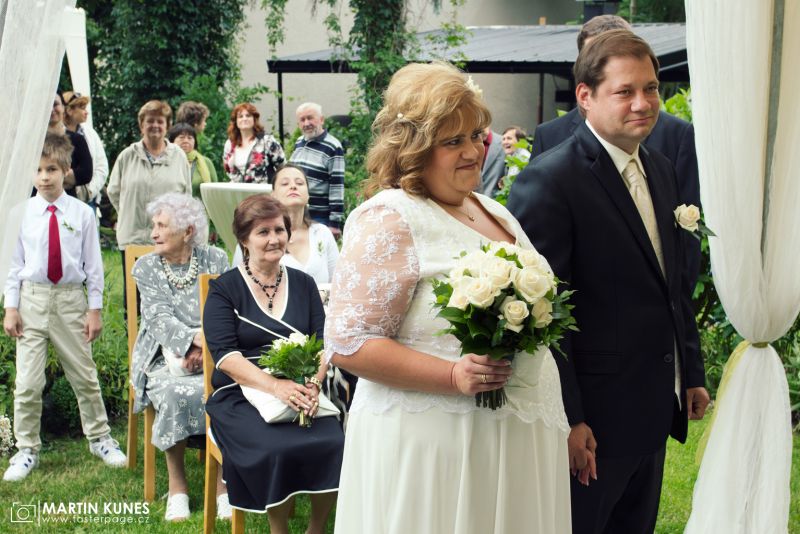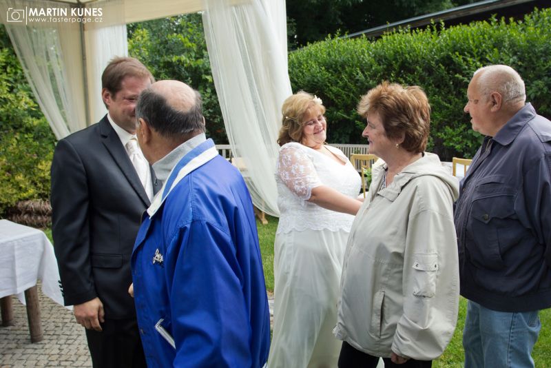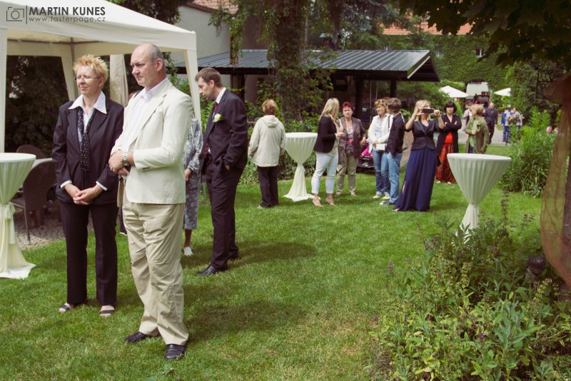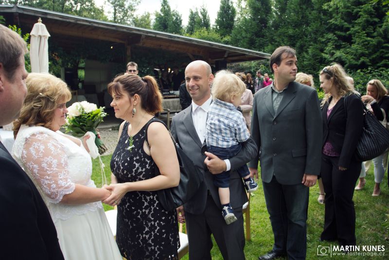 Celá svatba se měla odehrávat v restauraci „Čajovna“ v Říčanech u Prahy, respektive v jejích zahradách. Zde musím pochválit výběr prostor, mají to tam opravdu nádherné, všude spousta místa a otevřený prostor opět napomáhal k naprosto neformální a uvolněné náladě. Obřad samotný byl velmi stručný, což ocenili především rodiče s dětmi, ale zároveň obsahoval vše potřebné a žádoucí. Po obřadu nastoupila pěkná řádka gratulantů a já si teprve v tu chvíli uvědomil, kolik nás tam vlastně je. Jakmile jsme všichni poblahopřáli, mohli jsme se pustit do pár fotek čerstvých novomanželů a hned na to jsme se přemístili na hostinu, naštěstí to nebylo daleko, tipnul bych tak deset kroků.