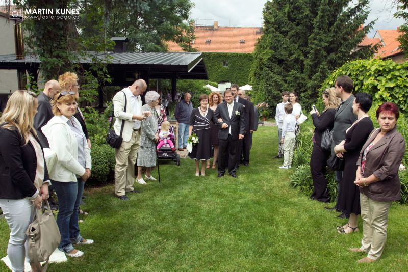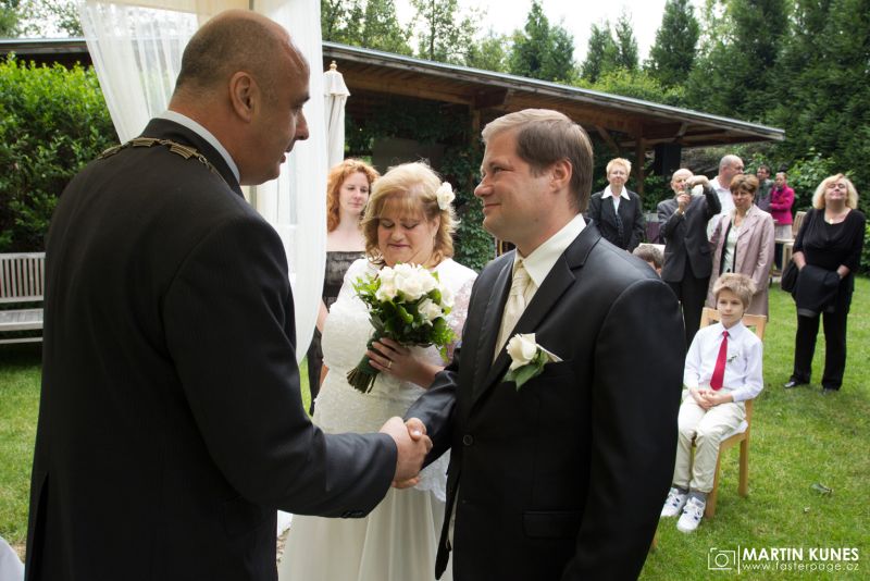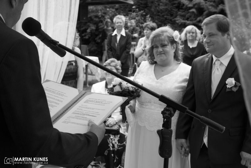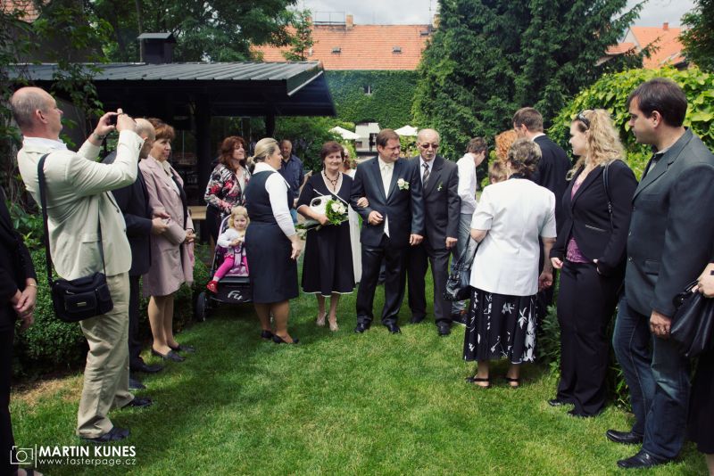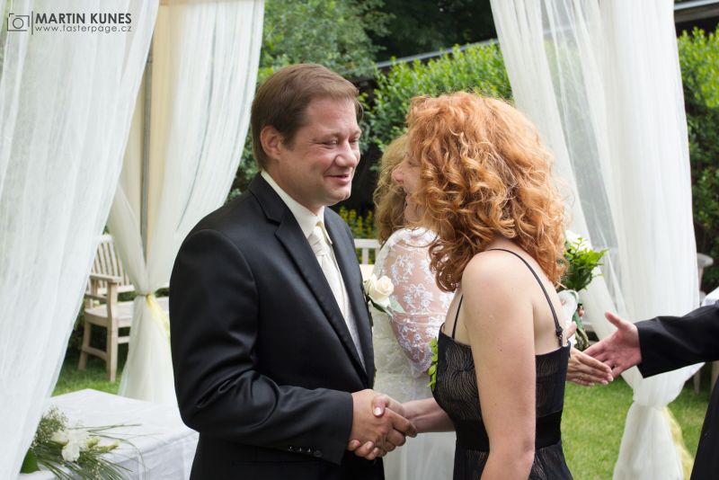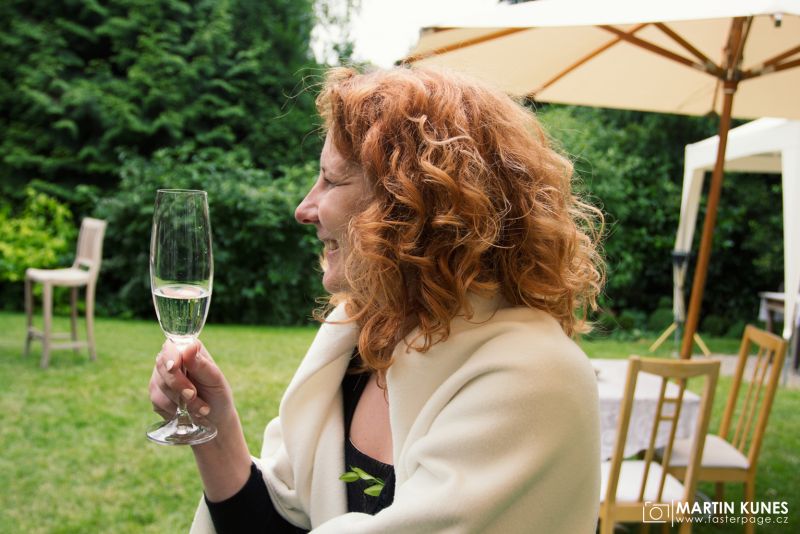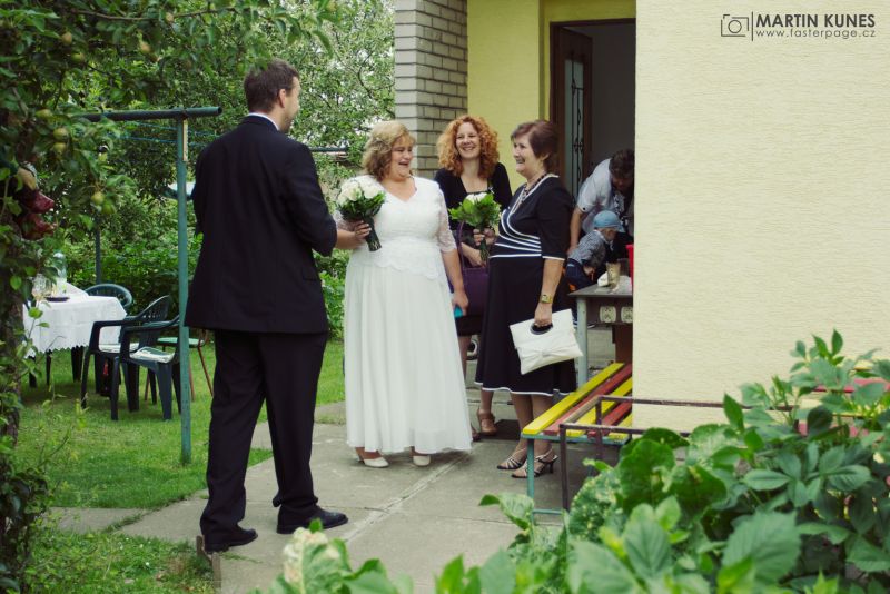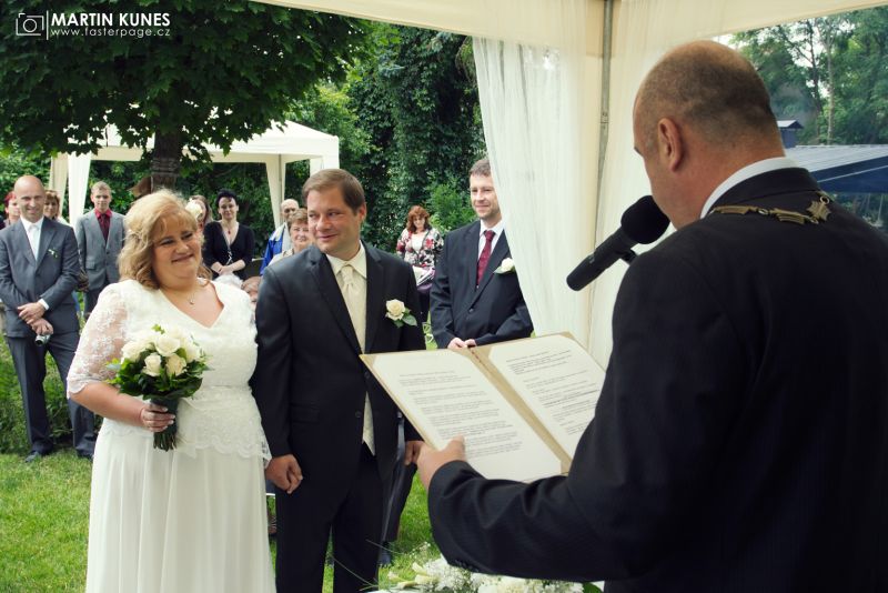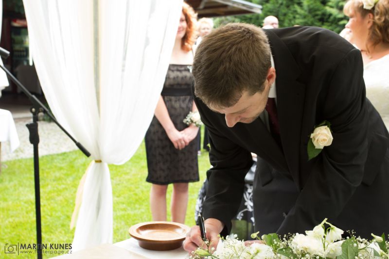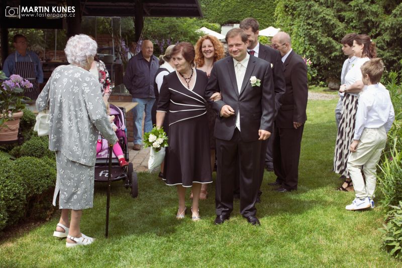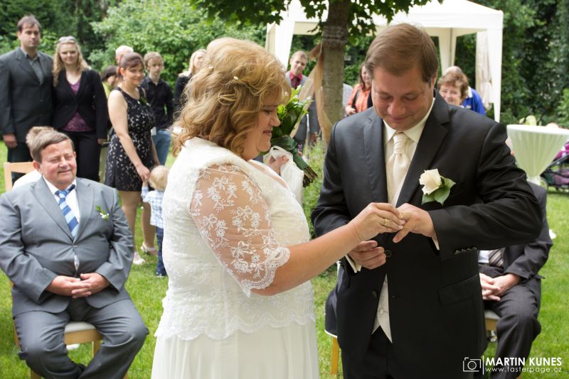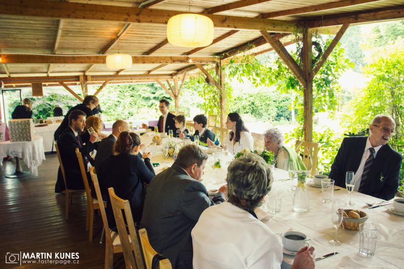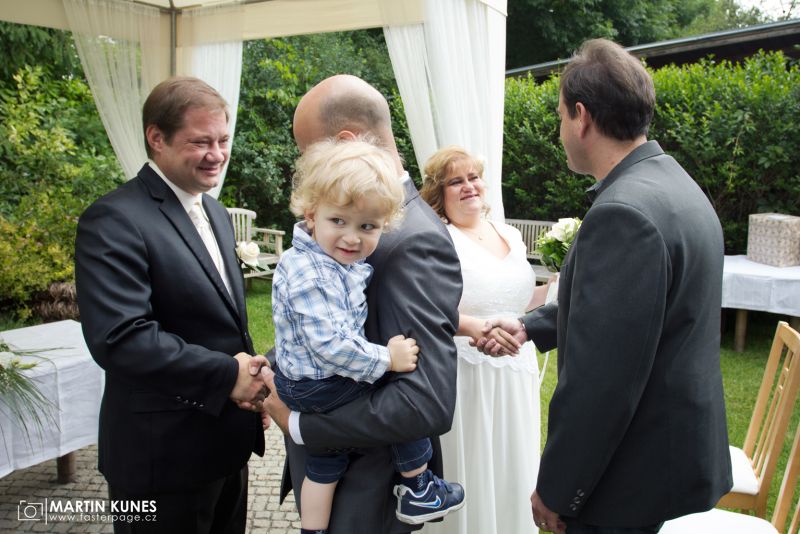 Celá svatba se měla odehrávat v restauraci „Čajovna“ v Říčanech u Prahy, respektive v jejích zahradách. Zde musím pochválit výběr prostor, mají to tam opravdu nádherné, všude spousta místa a otevřený prostor opět napomáhal k naprosto neformální a uvolněné náladě. Obřad samotný byl velmi stručný, což ocenili především rodiče s dětmi, ale zároveň obsahoval vše potřebné a žádoucí. Po obřadu nastoupila pěkná řádka gratulantů a já si teprve v tu chvíli uvědomil, kolik nás tam vlastně je. Jakmile jsme všichni poblahopřáli, mohli jsme se pustit do pár fotek čerstvých novomanželů a hned na to jsme se přemístili na hostinu, naštěstí to nebylo daleko, tipnul bych tak deset kroků.