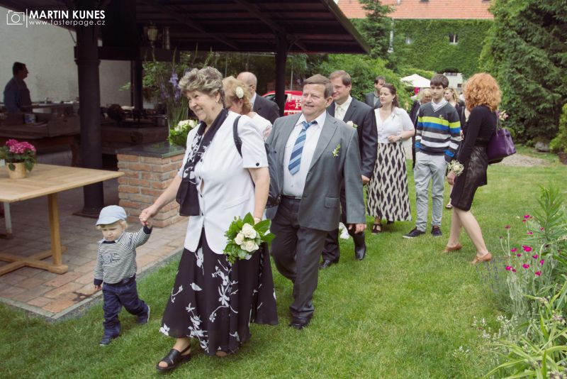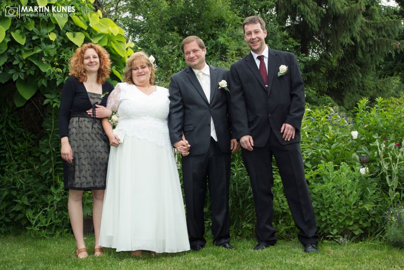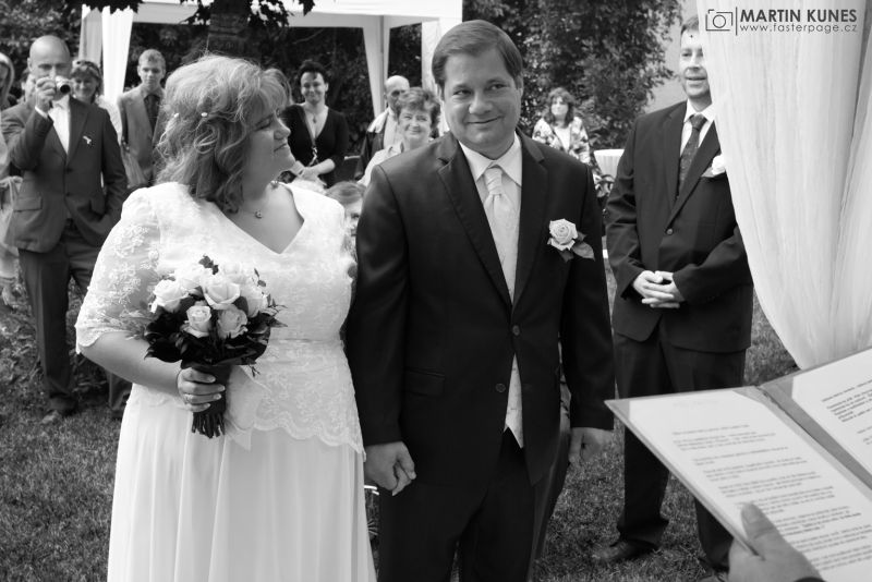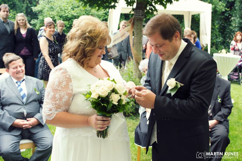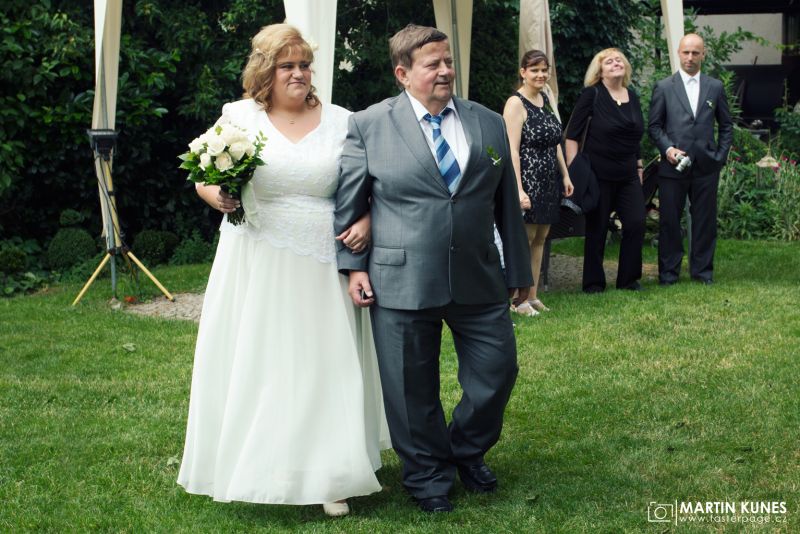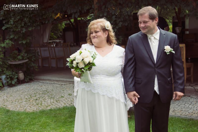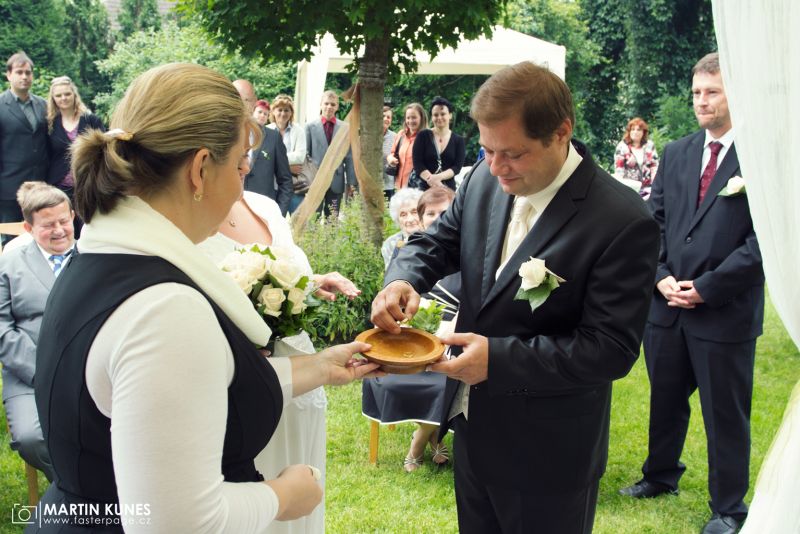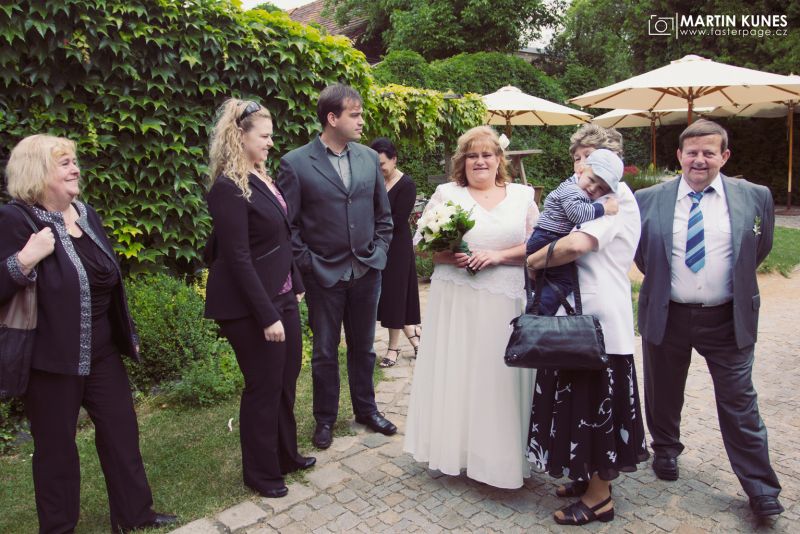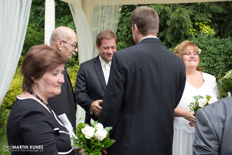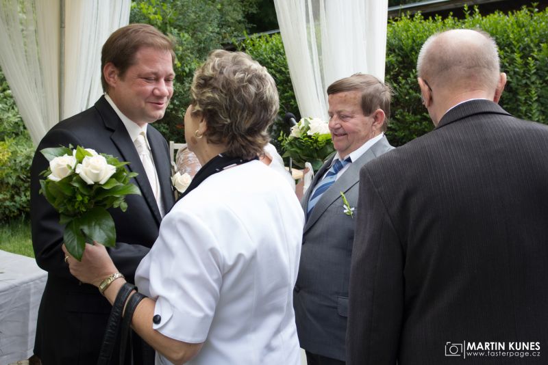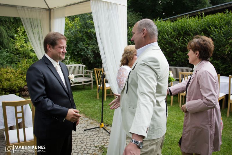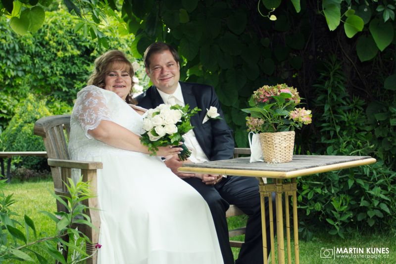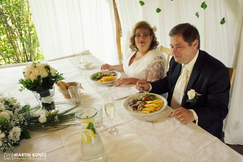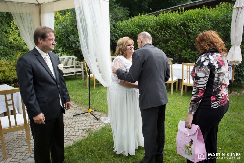 Celá svatba se měla odehrávat v restauraci „Čajovna“ v Říčanech u Prahy, respektive v jejích zahradách. Zde musím pochválit výběr prostor, mají to tam opravdu nádherné, všude spousta místa a otevřený prostor opět napomáhal k naprosto neformální a uvolněné náladě. Obřad samotný byl velmi stručný, což ocenili především rodiče s dětmi, ale zároveň obsahoval vše potřebné a žádoucí. Po obřadu nastoupila pěkná řádka gratulantů a já si teprve v tu chvíli uvědomil, kolik nás tam vlastně je. Jakmile jsme všichni poblahopřáli, mohli jsme se pustit do pár fotek čerstvých novomanželů a hned na to jsme se přemístili na hostinu, naštěstí to nebylo daleko, tipnul bych tak deset kroků.