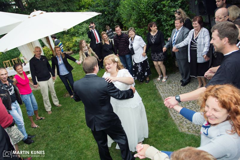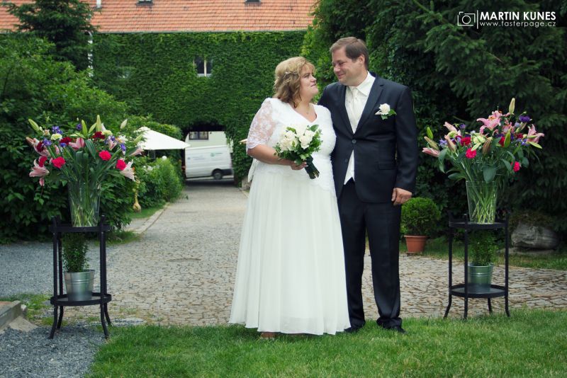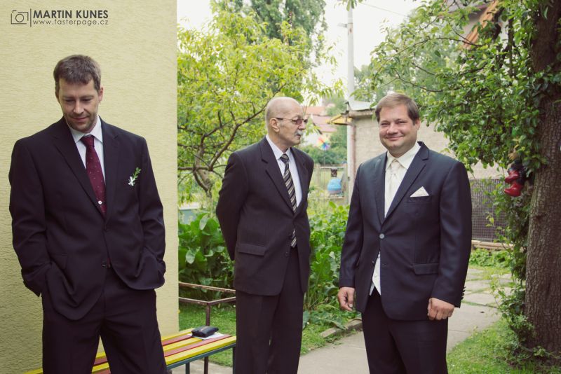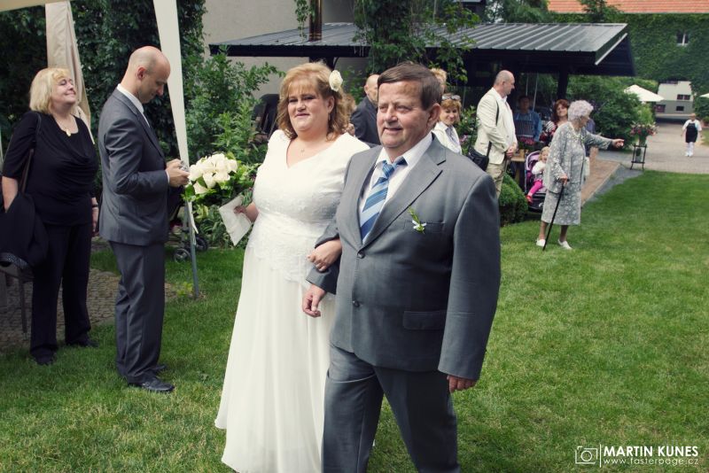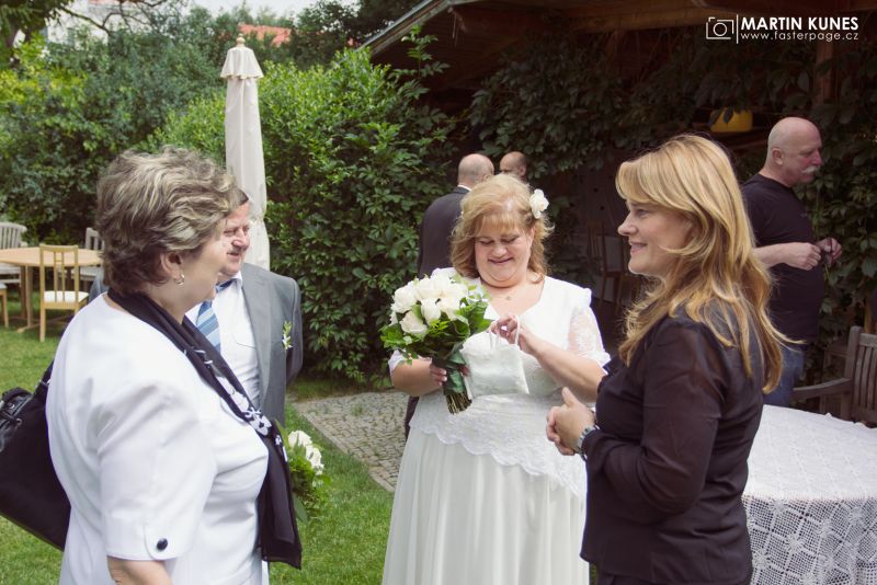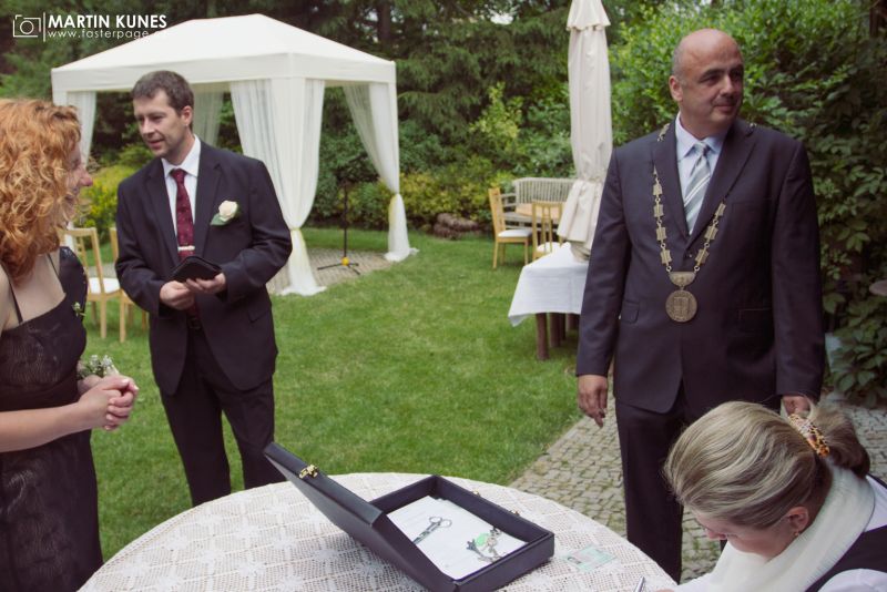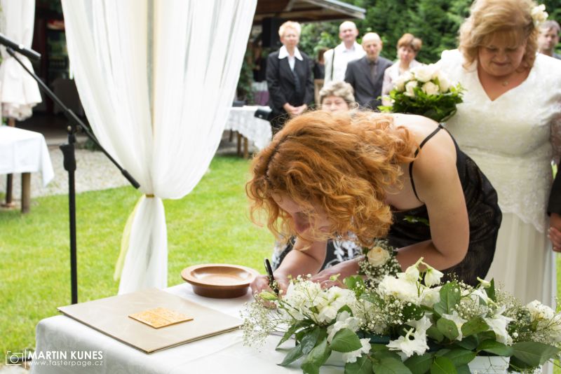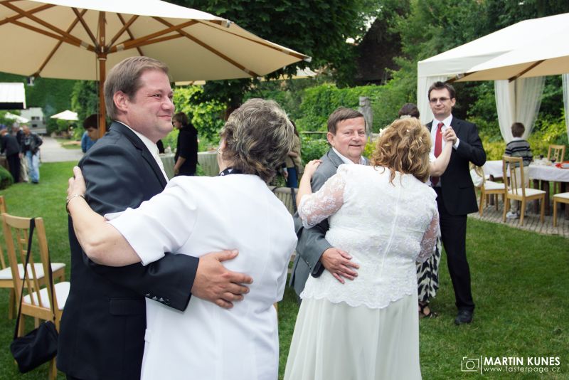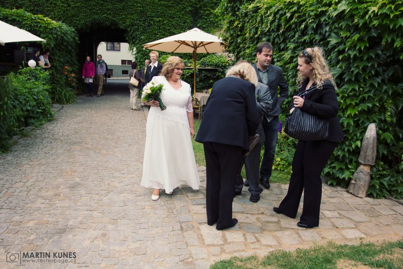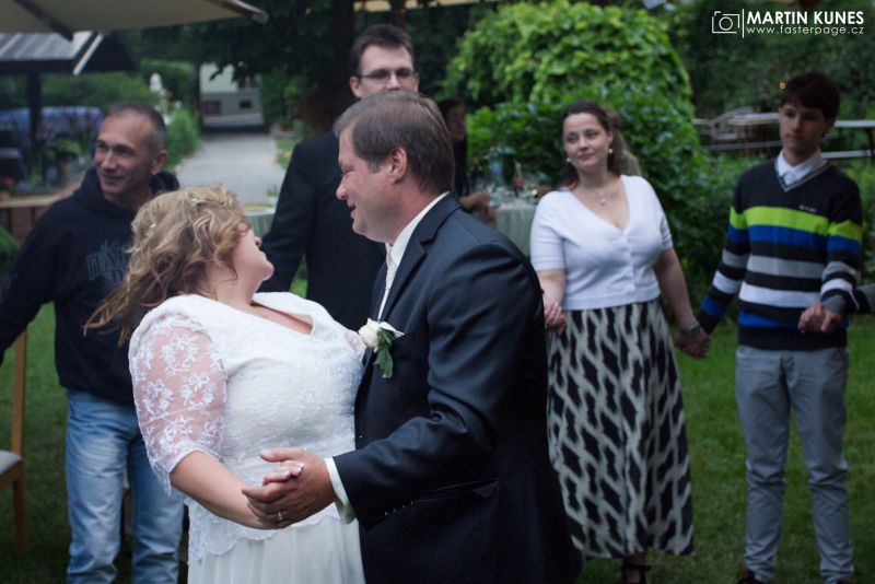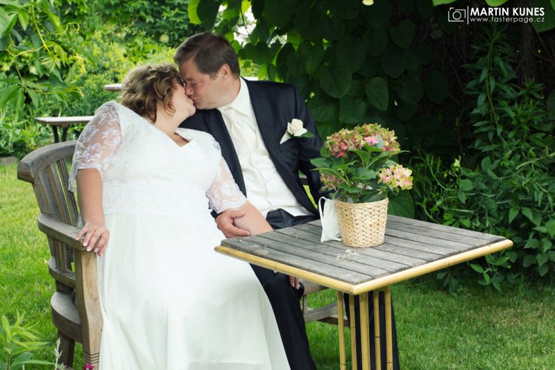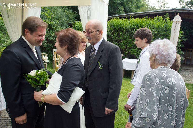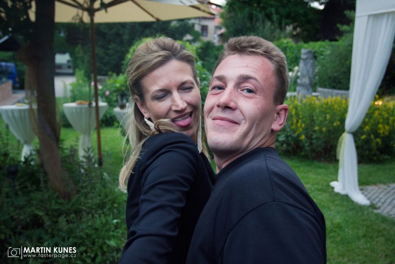 Celá svatba se měla odehrávat v restauraci „Čajovna“ v Říčanech u Prahy, respektive v jejích zahradách. Zde musím pochválit výběr prostor, mají to tam opravdu nádherné, všude spousta místa a otevřený prostor opět napomáhal k naprosto neformální a uvolněné náladě. Obřad samotný byl velmi stručný, což ocenili především rodiče s dětmi, ale zároveň obsahoval vše potřebné a žádoucí. Po obřadu nastoupila pěkná řádka gratulantů a já si teprve v tu chvíli uvědomil, kolik nás tam vlastně je. Jakmile jsme všichni poblahopřáli, mohli jsme se pustit do pár fotek čerstvých novomanželů a hned na to jsme se přemístili na hostinu, naštěstí to nebylo daleko, tipnul bych tak deset kroků.