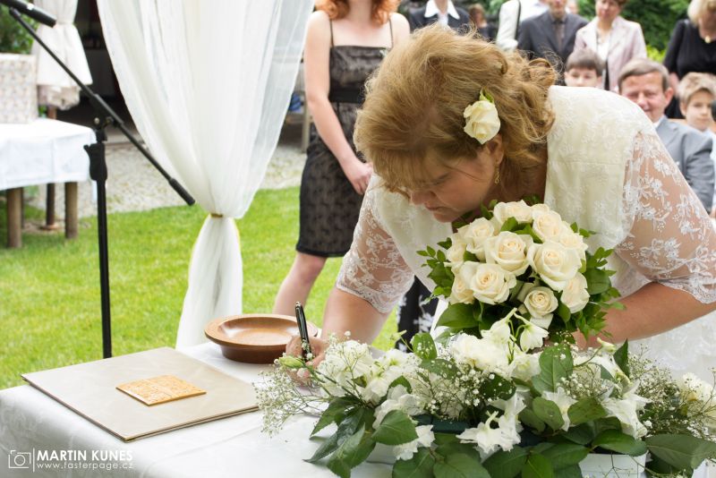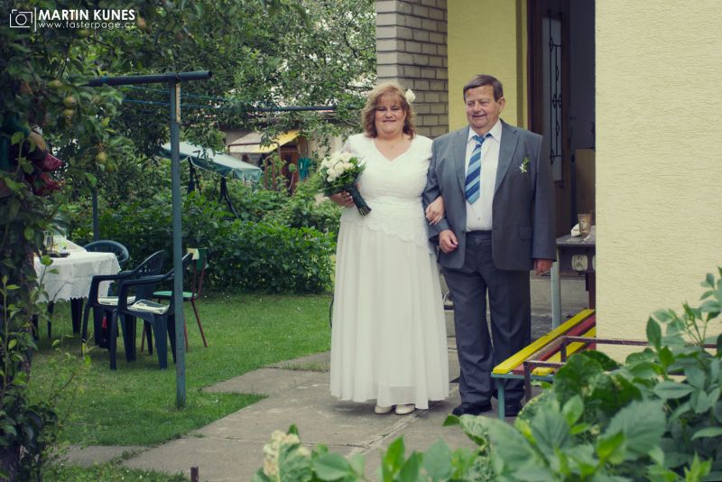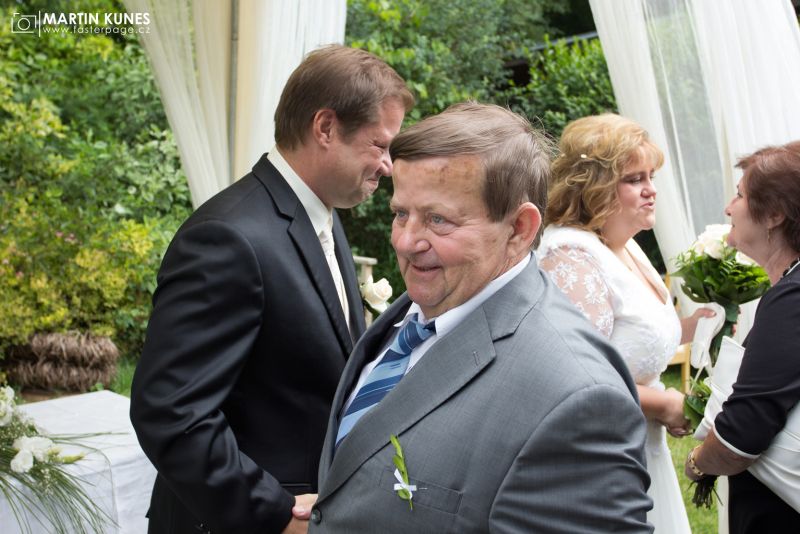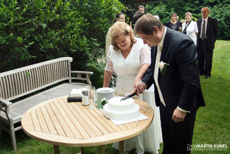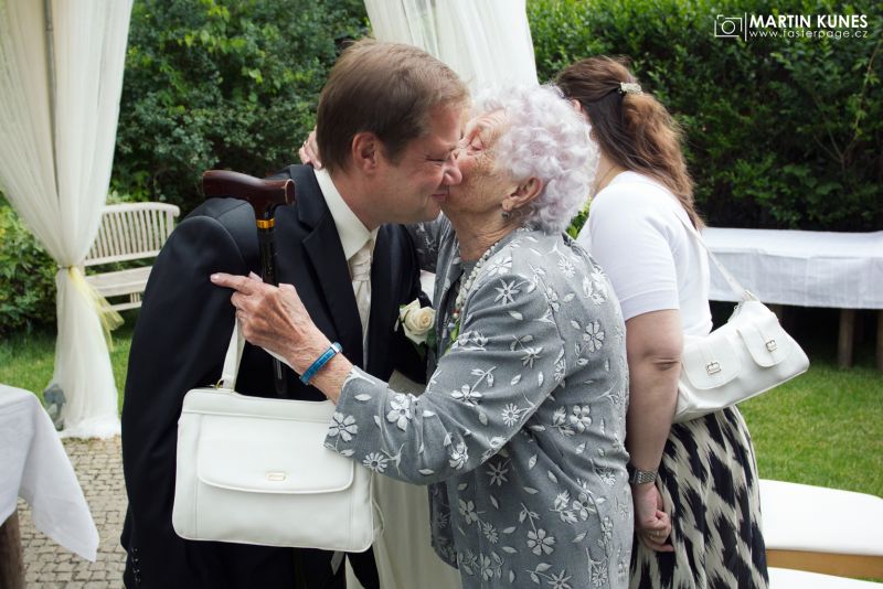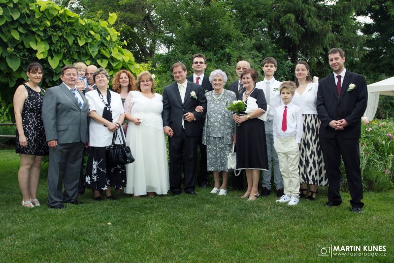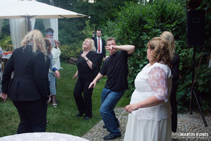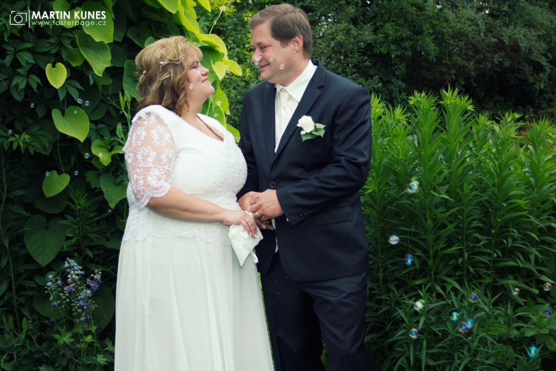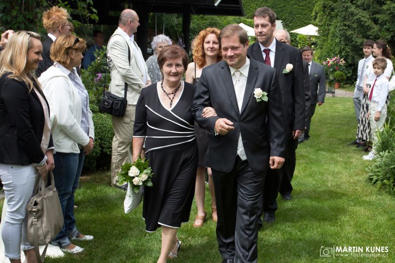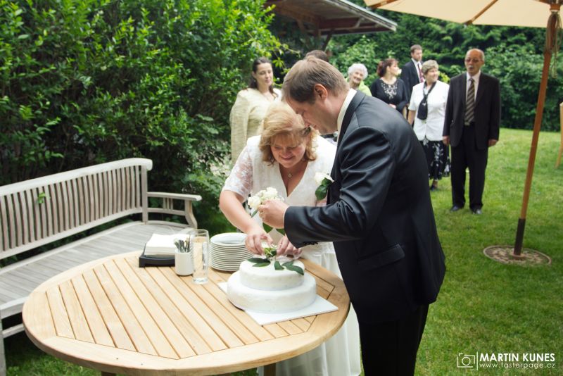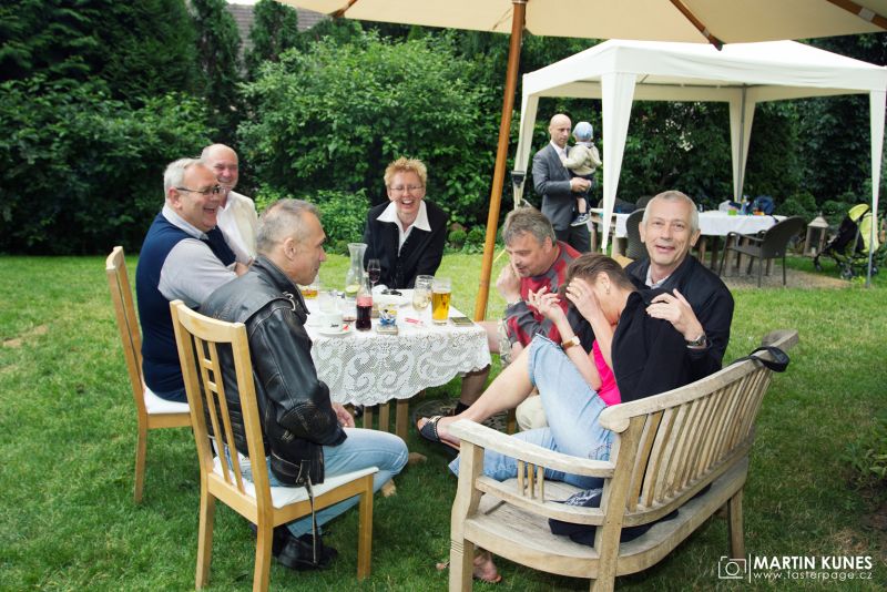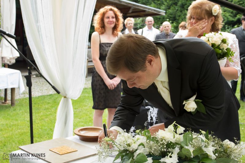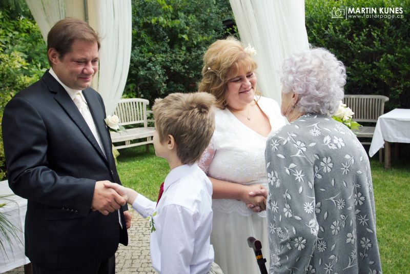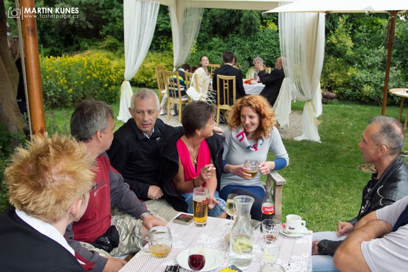 Celá svatba se měla odehrávat v restauraci „Čajovna“ v Říčanech u Prahy, respektive v jejích zahradách. Zde musím pochválit výběr prostor, mají to tam opravdu nádherné, všude spousta místa a otevřený prostor opět napomáhal k naprosto neformální a uvolněné náladě. Obřad samotný byl velmi stručný, což ocenili především rodiče s dětmi, ale zároveň obsahoval vše potřebné a žádoucí. Po obřadu nastoupila pěkná řádka gratulantů a já si teprve v tu chvíli uvědomil, kolik nás tam vlastně je. Jakmile jsme všichni poblahopřáli, mohli jsme se pustit do pár fotek čerstvých novomanželů a hned na to jsme se přemístili na hostinu, naštěstí to nebylo daleko, tipnul bych tak deset kroků.