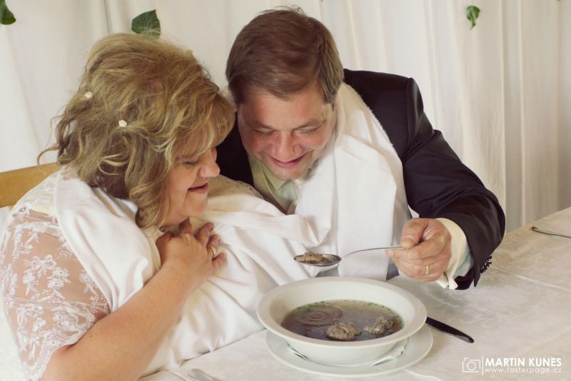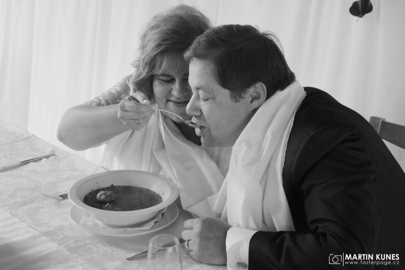 Hostina byla tradičně vynikající, pochutnali jsme si hned na několika chodech a v kuchyni na nás rozhodně nešetřili. Výborného jídla bylo tolik, že jsme dort odložili na později, do nikoho by se totiž nevešel. Po jídle se chvíli povídalo, vyfotil jsem prstýnky, někteří z nás se šli převléknout na volnou zábavu a já přemístil vůz novomanželů zpátky k jejich domu, aby se na něj nezapomnělo. Během podvečerní zábavy se samozřejmě tančilo, popíjelo a jak už jsem zmínil v nadpisu, došlo taky k únosu. I tady jsme to pojali trochu netradičně a se slovy „Nevěsty unášejí jenom amatéři“ jsme popadli ženicha a šlo se. Po cca hodině a půl nás sice našli, ale mezitím jsme se pěkně pobavili a zadarmo jsme ho taky nevydali. Pak už pokračovala raději nekomentovaná zábava a to až do časných ranních hodin.